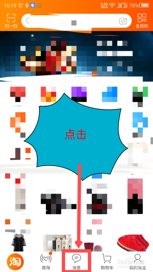 在淘宝首页界面,点击底部导航栏中的动静。如图所示