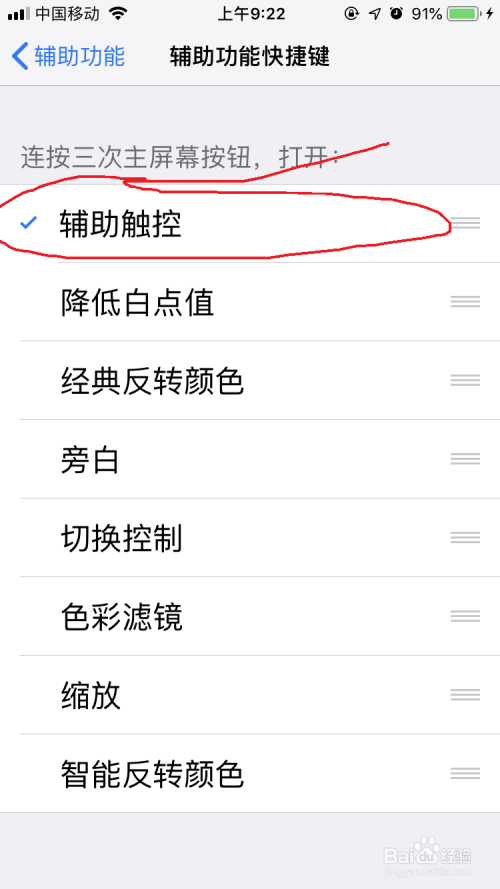 勾选“辅助功能”,今后只需连按三次home键,即可开启、封闭小白点。