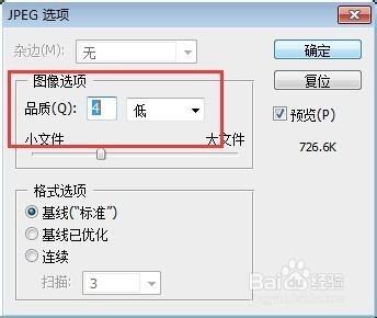 在弹出的WEB格局转换属性框里面,选择JPEG-低。