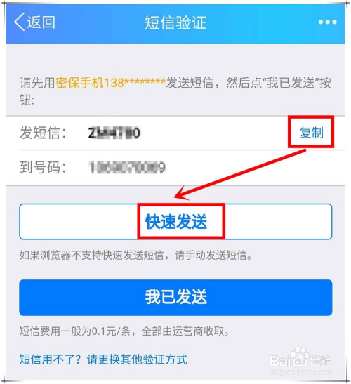 然后,系统会提醒要求你用密保手机给指定的号码发送一条指定内容的短信。首先,点击“复制”按钮将短信内容复制下来,再点击“快速发送”切换到短信发送窗口。