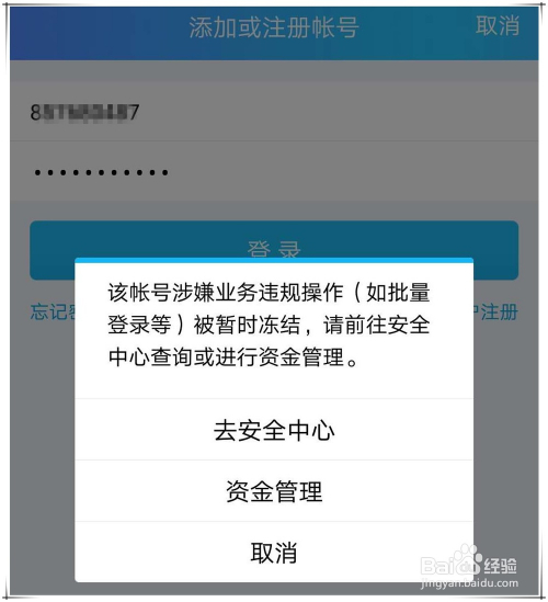 按照限制登录时的提醒信息,我们在手机上打开QQ,并输入被限制的QQ号码及密码,点击登录,登录界面弹出如下图所示对话框。