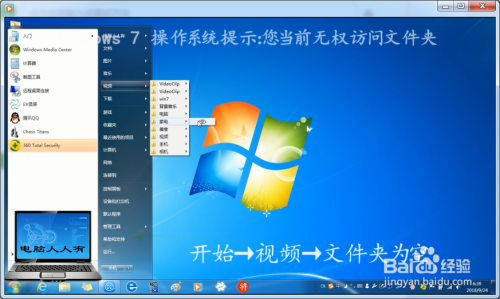 新装Windows 7 操作系统之后,开始菜单→视频(在外盘)→下级文件竟然是空的(其实是有视频文件的)。