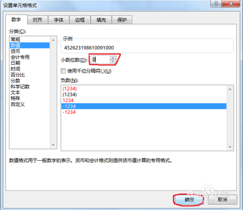 【2】若是输入的数值有小数点,我们在小数位数选摘要显示的小数位,我们输入数值为身份证号,不需要显示小数点,这里我们设置为0。设置OK后,点击确定按钮。