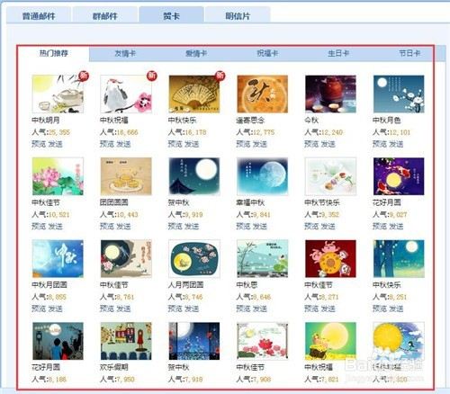 在热点贺卡中,就可以看到良多中秋贺卡了,点击本身喜好的贺卡,可以先“预览”,喜好的话,就点击“发送”