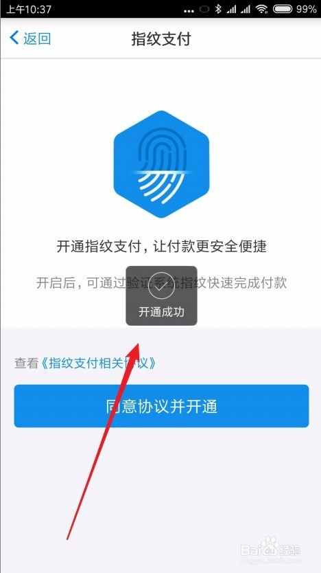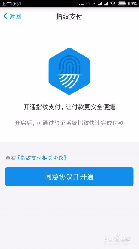 这时就会弹出指纹付出的开通页面,点击“赞成和谈并开通”按钮。