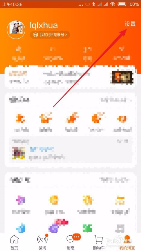 在手机上打开手机淘宝,然后在打开的我的淘宝页面中,我们点击右上角的“设置”按钮。