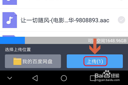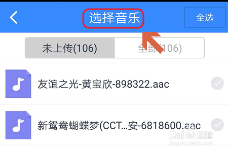 我们以上传音乐文件为例,点击适才页面中的“音乐”之后,系统就会打开我们手机当地音乐文件了,勾选要上传的音乐然后点击右下角的“上传”两字;
