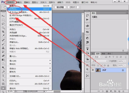 打开Photoshop软件,选择文件菜单中的打开号令,打开一张人物图片。
