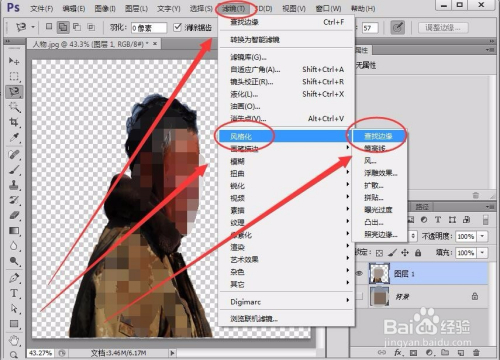 封闭布景图层,单击滤镜菜单,选择气概化---->查找边缘选项。