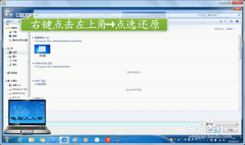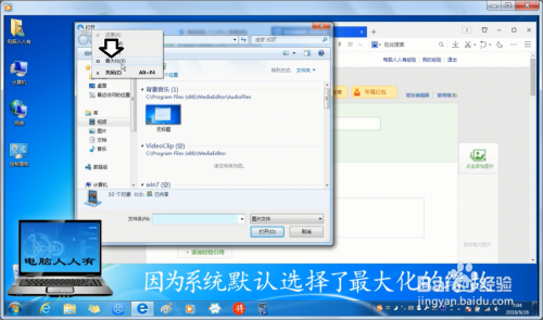 打开经验草稿纸,点击添加图片,对话框满屏,利用鼠标调节也无济于事,这是因为重装系统后,默认选择了最年夜化的缘故→选择还原即可。