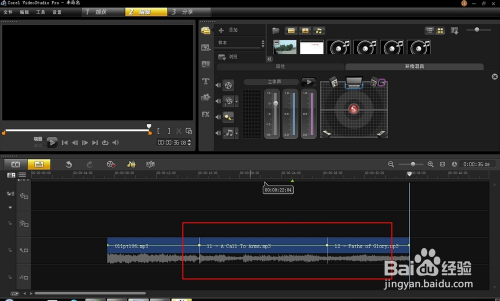 先对第一首音乐进行裁剪。先把其拖拽到声音轨上。