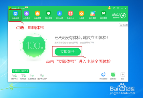 在360安全卫士本家儿页面,选择上方的“电脑体检”,在弹出的体检页面点击“当即体检”进入电脑周全体检过程。