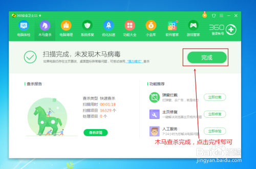 查杀完当作,点击“完当作”,返回到360安全卫士本家儿页面。