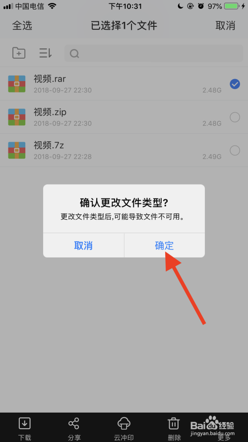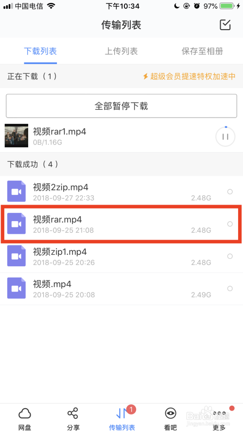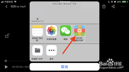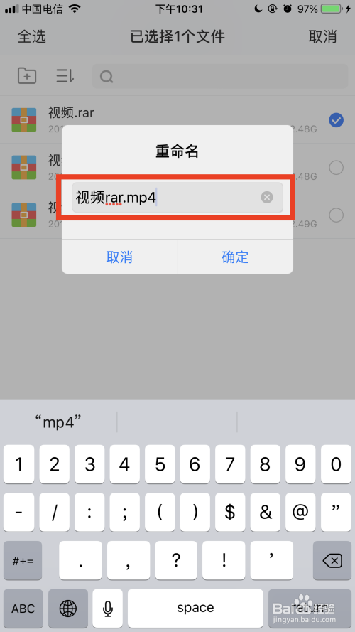 打开iOS百度网盘app,选择需要下载并解压的文件,然后把文件重定名为mp4后缀。