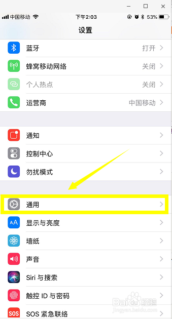 第二步、然后点击“设置”菜单选项进入,屏幕往上滑找到“通用”菜单选项。如下图所示: