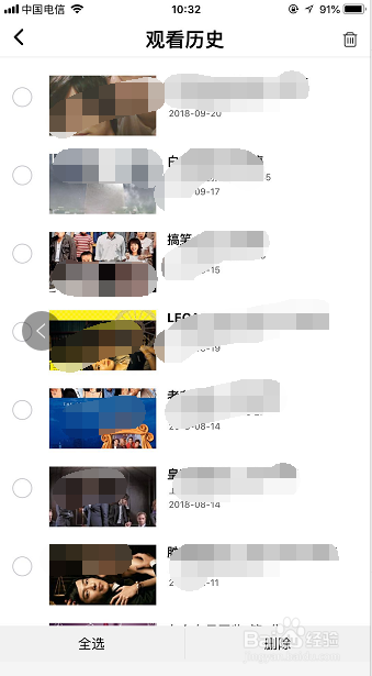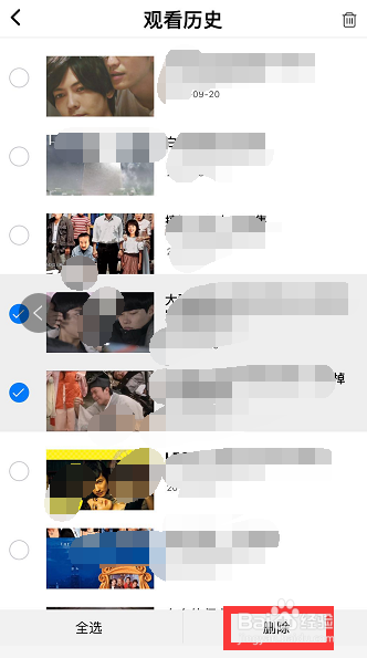 如图,选择想要删除的不雅看汗青点击右下角【删除】。若是想要删除所有不雅看记实,便点击左下角【全选】,再点击【删除】。