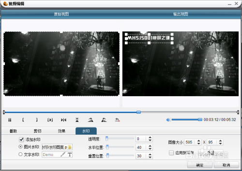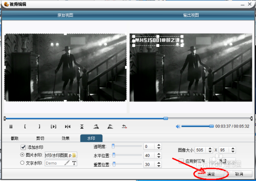 点击【视频编纂】,弹出视频编纂窗口,点击下方【水印】,勾选【添加水印】、【图片水印】,点击【浏览】找到水印图案文件并打开;