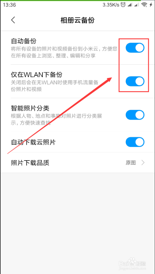 在“相册云备份”中依次打开“主动备份”“仅在WLAN下备份”,如许的话就能把手机里面的图片备份到云端了。