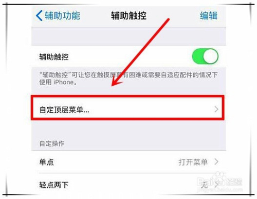 其实我们只需再简单设置一下,就可以让小白点截屏变得更简洁。依然是在辅助触控设置页面,找到“自定顶层菜单”选项,点击进入,在该页面中可以定制顶层菜单内容,即点击小白点后弹出窗口中的内容。