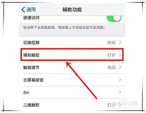 在辅助功能设置页面中,标的目的下翻动页面,就可以找到“辅助触控”选项,点击该选项进入下一步操作。