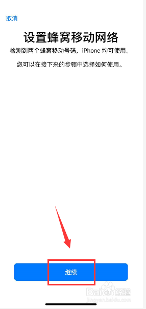开机有标的目的导提醒,检测到双移动蜂窝旌旗灯号,点击继续,如下图所示