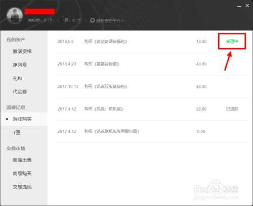 将鼠标放在受理中的游戏名称那列上,点击撤销退条目。