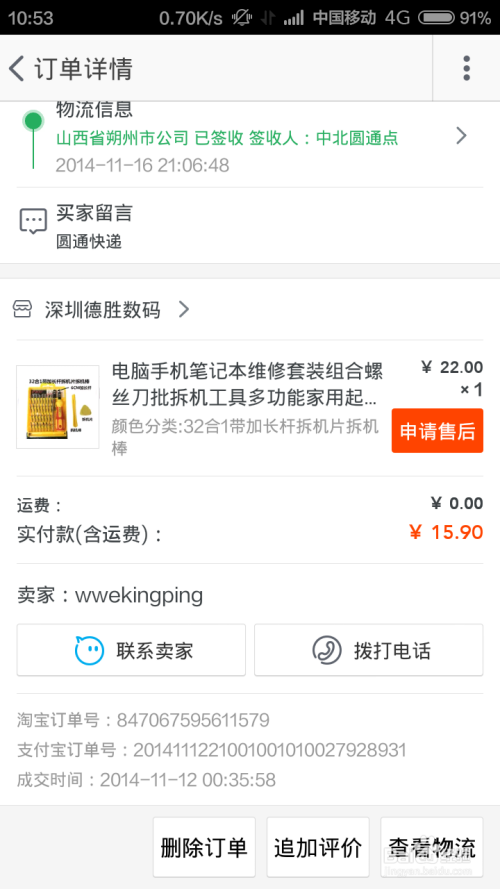 查看我的订单今后,随便点击进入一个订单,查看订单详情页。