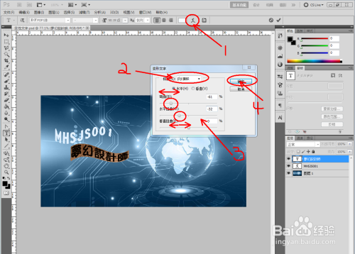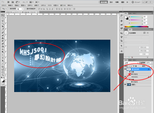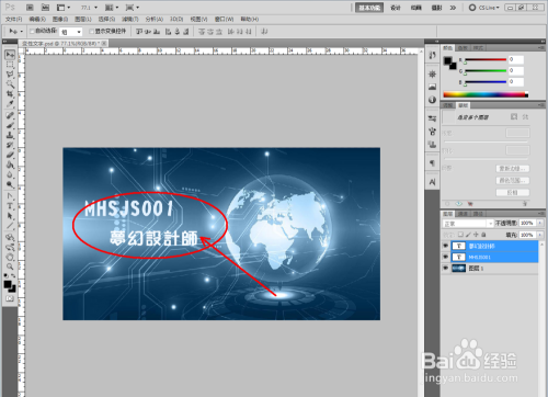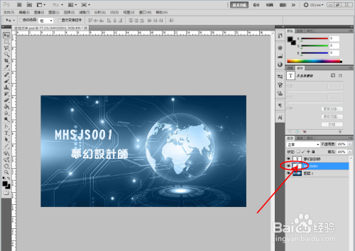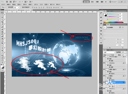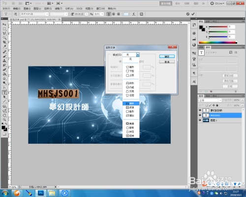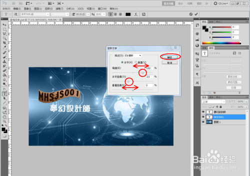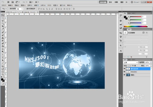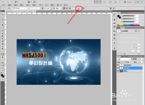 点击【文字东西】,输入“MHSJS001”、“梦幻设计师”字样后,别离双击“MHSJS001”文字图层【T】,对文字的字体、大小、颜色进行设置;