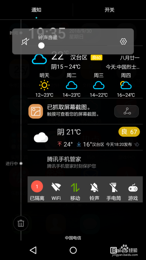 这时退出“手机管家”,就可以同时按住侧面的本家儿键和音量减小键截屏并保留了。