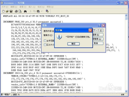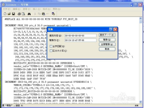 回到记事本窗口,--编纂--替代---把查找内容设为为00-00-00-00-00-00,替代为一栏设置当作你方才记下的MAC地址---点击’全数替代‘---把窗口关失落