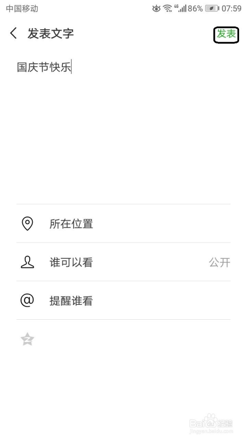 在这个界面的需要颁发说说在文本框中输入你想要颁发的文字。好比国庆节欢愉。