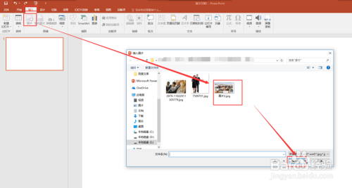 切换到菜单中的插入菜单,在插入菜单中找到插入图片号令,在弹出的“插入图片”窗口中,找到我们要作为照片墙展示的图片,选中该图片,然后点击插入将该图片插入到幻灯片页中。