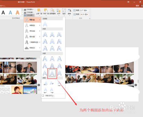 选中两个椭圆,为其添加一个内手下暗影的结果;然后在幻灯片的上下空白位置输入你要输入的文字;在选中组合后的图片,为组合后的图片添加一个标的目的右呈现的动画结果,按F5播放演示文稿,一个巧用椭圆东西做立体照片墙的动画就完当作了。