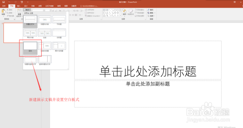 双击打开我们的PPT 2016演示文稿编纂软件,新建一个新的演示文稿,进入到PPT 2016操作界面中,设置幻灯片的板式为空白。