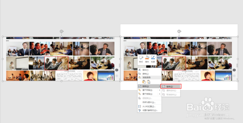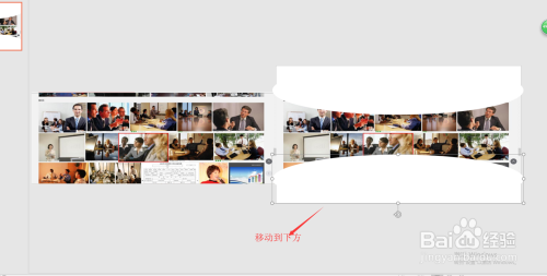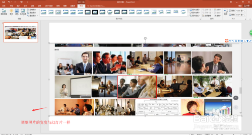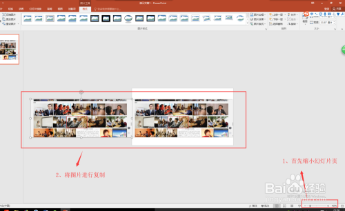 选中插入到幻灯片页中的图片素材,调整其宽度和高度,高度适中即可,宽度要与幻灯片页的宽度对齐;然后缩小幻灯片页显示,按住Ctrl和shift键在程度复制出一个图片出来;选中这两个图片素材右键鼠标将其组合到一路。
