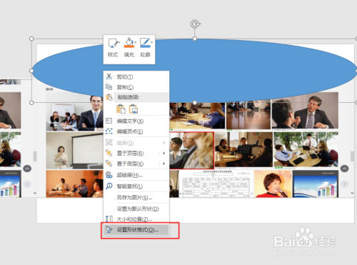 然后选择插入菜单中的外形号令,在外形中找到卵形状,然后在幻灯片页上绘制出一个大小比幻灯片稍微年夜一点的椭圆出来;选中该椭圆,右键鼠标选择设置外形格局号令。