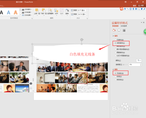 点击设置外形格局号令之后,会在PPT 2016界面的右侧呈现一个设置外形格局的窗口,然后设置该椭圆的填充为纯色填充,颜色设置为白色;线条选择为无线条。