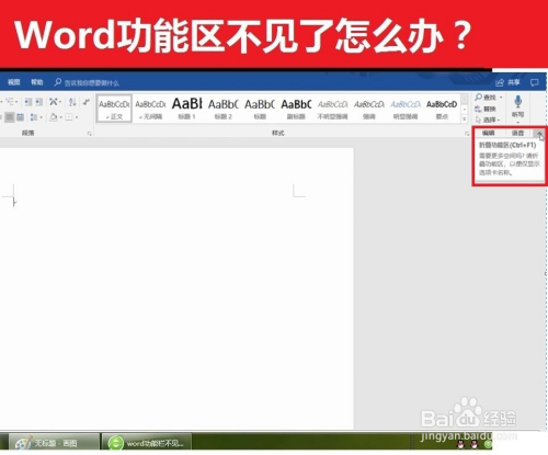 功能区是怎么不见的呢?有些伴侣可能是无意中点击了右上角的【折叠功能区】按钮,呈现了功能区不见了的现象。或者是需要更多空间,按了节制键Ctrl+F1键后,呈现了功能区不见了的现象。