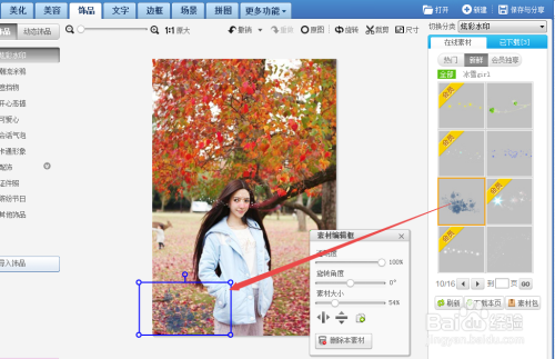 然后在右侧的素材中,按照现实需要选择;选择好之后,调整它的位置,透明度,角度等等,完当作之后,保留图片即可。