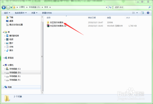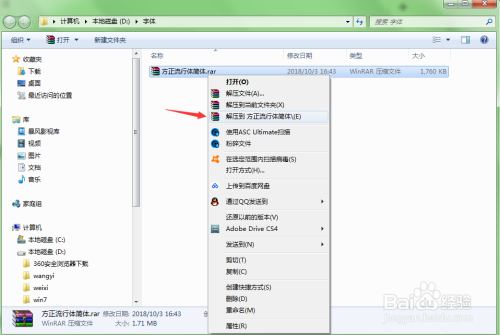 在字体的压缩文件上右击,选择右键菜单中的"解压到朴直风行体简体"。