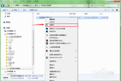 这时我们会看到此文件夹中有一个字体文件,在字体文件上点击鼠标右键,在呈现的右键菜单中选择“安装”。