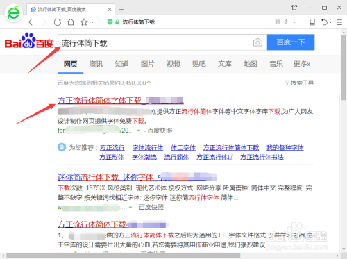 打开百度首页,在搜索框中输入你想要的字体。我们需要的字体在第一个搜刮成果中,所以点击第一个搜刮成果。