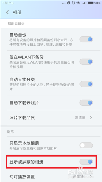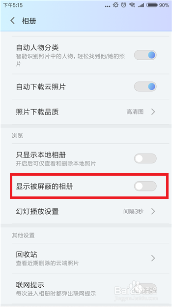 接下来会打开相册的设置界面,找到此中的【显示被屏障的相册】并把后方的选项给打开,如许就能显示出被屏障的相册了。