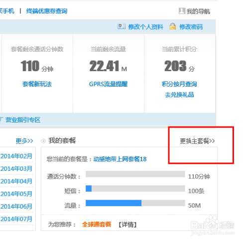 进入本家儿页面之后,就会看到当前的账户信息,如下图所示,我们点击“改换本家儿套餐”。