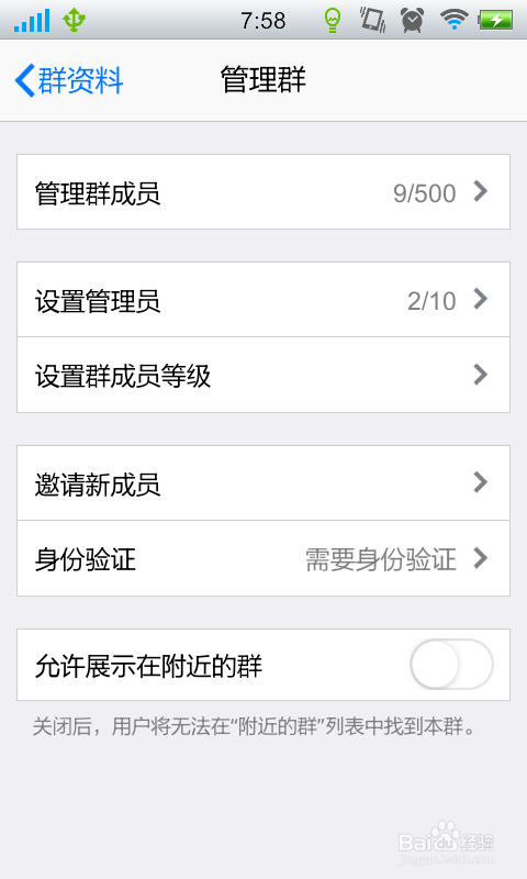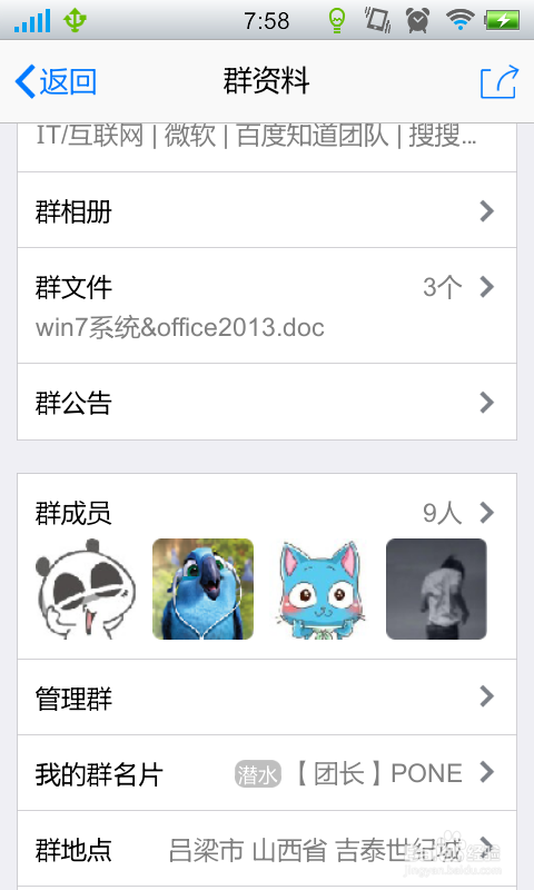 在该群组的显示本家儿界面中,点击右上角,将打开“群资料”页面。