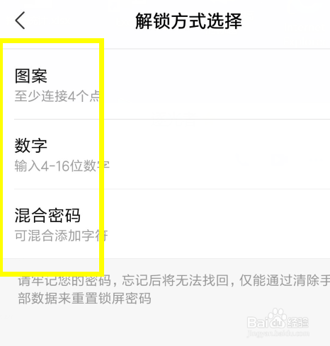 然后我们选中一个枷锁的体例,图案--数字或者是指纹或者是组合。