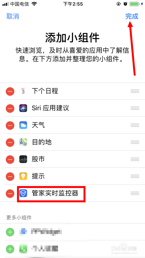 回到界面最上端,可以看到 管家及时监控器 呈现在已添加的小组件里面,再点击右上角的 完当作 。