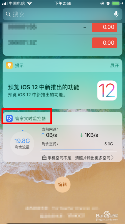 将腾讯手机管家及时监控器添加至iPhone widget,可以让我们及时看到iPhone的利用环境,包罗流量利用环境、内存环境以及及时网速。当然,前提是已经在手机上下载了腾讯手机管家App,并已对流量德律风进行过设置。