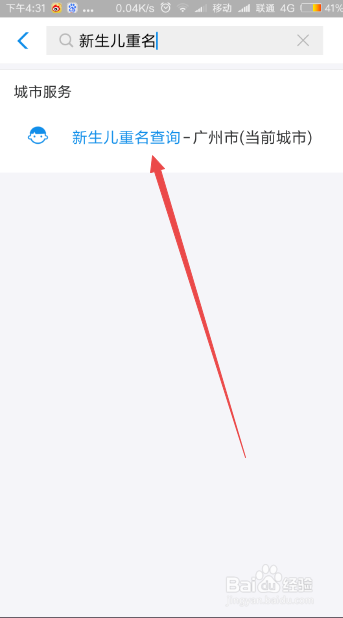然后会弹出一个定位信息,按照需要选择,打开的页面中点击上面的搜索框,输入 新生儿重名查询,搜刮。