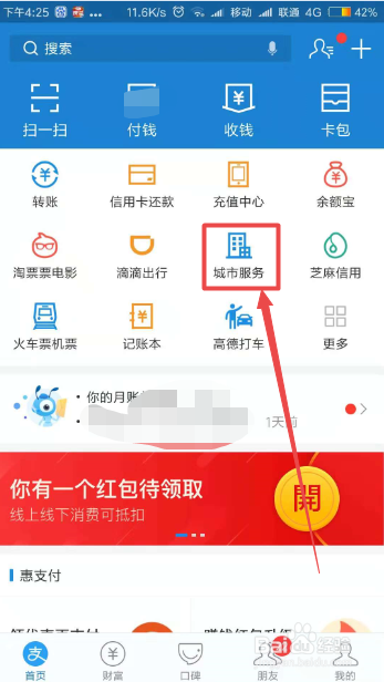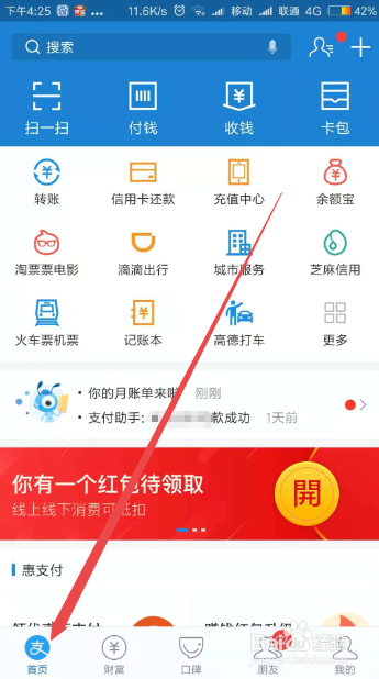 然后点击手机桌面上面的 付出宝 图标来登岸它,登岸当作功之后,来到了它的首页页面。